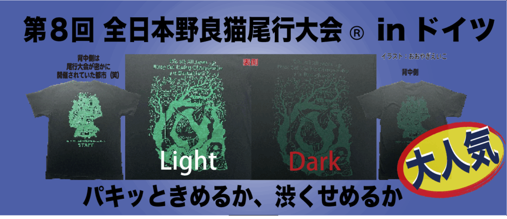 猫中毒のド定番シリーズ、「全日本野良猫尾行大会ⓇスタッフTシャツ」。バーチャルな大会なので、第4回目以降は、なぜかワールドワイドに。その隙をついて、日本ではご当地版が登場!