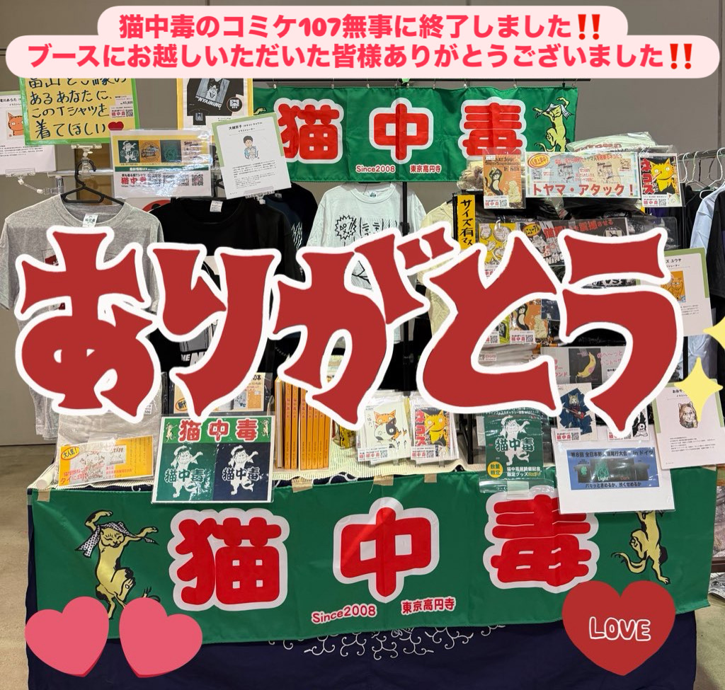【出展終了】12月30日(火)コミックマーケット107 東京ビッグサイト ブース:西2ホール『あブロック69-ab』 2025年12月31日 最終更新日時 : 2026年1月3日 猫中毒スタッフ 2025年最後のイベント出展です^^ コミケ107で猫納め❗❗ 持っていくTシャツのラインナップです。猫中毒のTシャツで新年を笑顔で迎えましょう❗❗ イベント限定!猫中毒展開催記念グッズのポスカと缶バッチ❗❗ お買い逃しないようにね^^ FacebookXBlueskyCopy