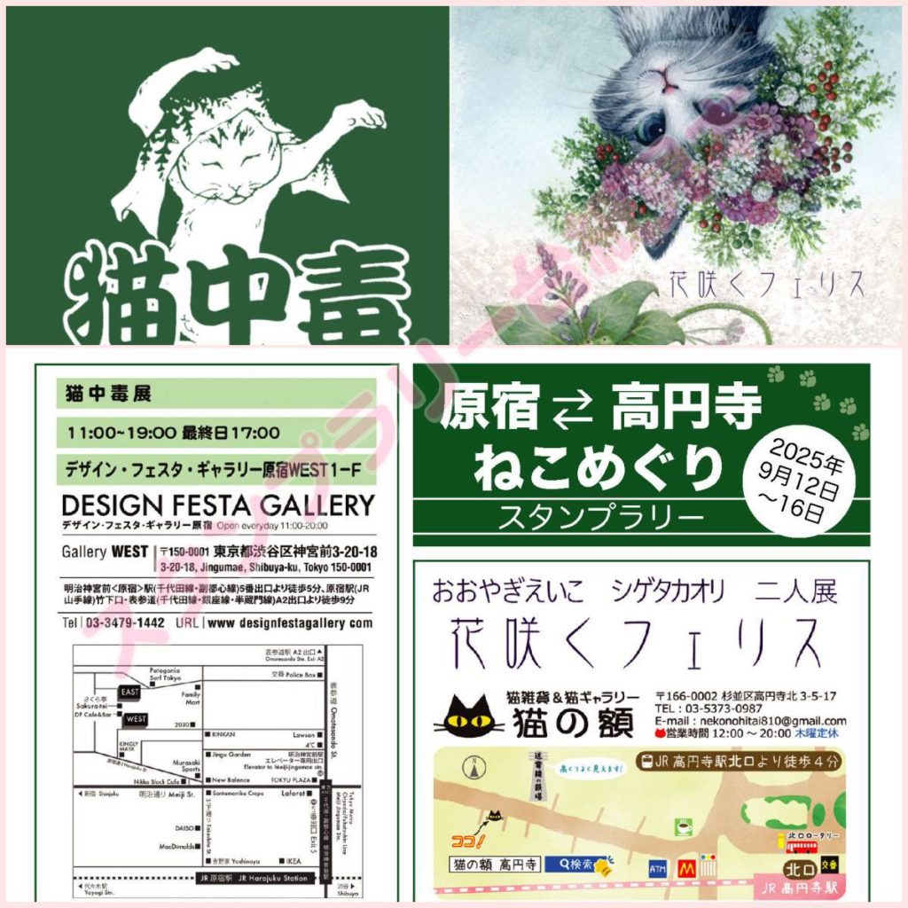『猫中毒展(デザインフェスタギャラリー原宿)』と『花咲くフェリス 二人展(猫雑貨&猫ギャラリー猫の額)』が対象になります。両方の猫作家展を制覇された方には、どちらかの会場で特製猫缶バッチを進呈♪(台紙にチェックが入ります)。スタンプラリーは来場された方が対象です。参加されたい方には、台紙をお渡ししますので、原宿と高円寺のギャラリーで猫を愛でましょう^^